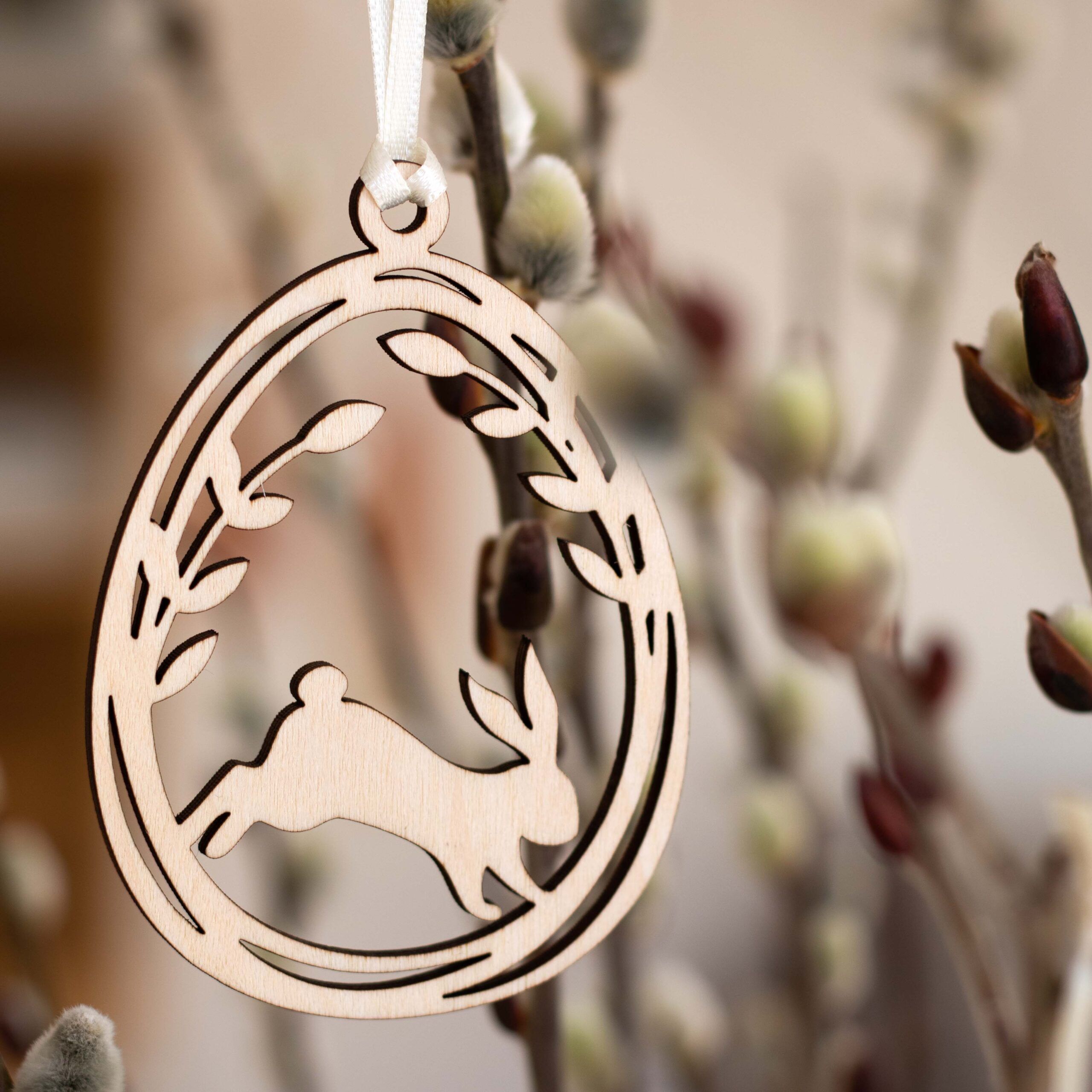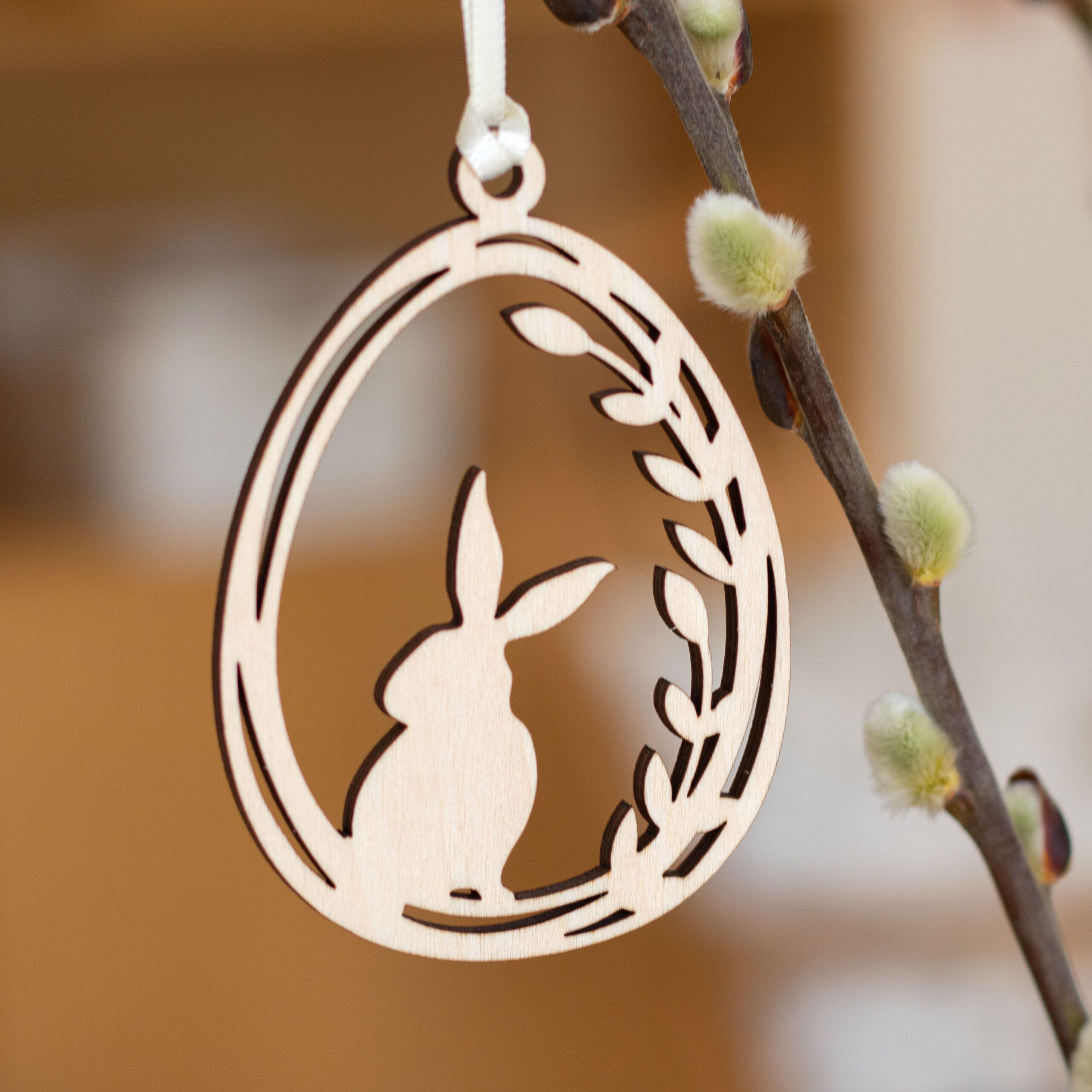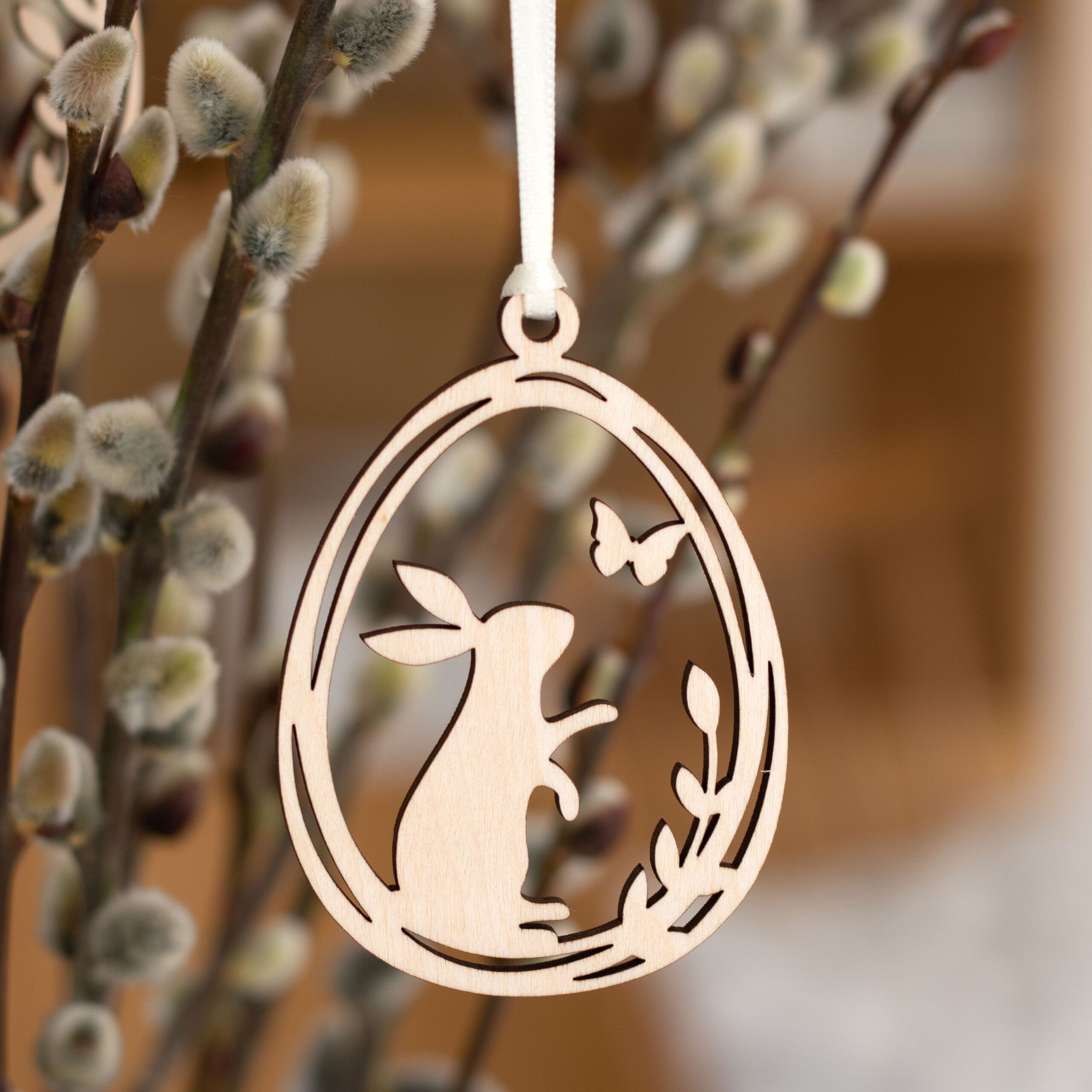Die Holzanhänger mit den süßen Osterhäschen im Weidekätzchenei sind hübsche Anhänger für jeden Osterstrauß.