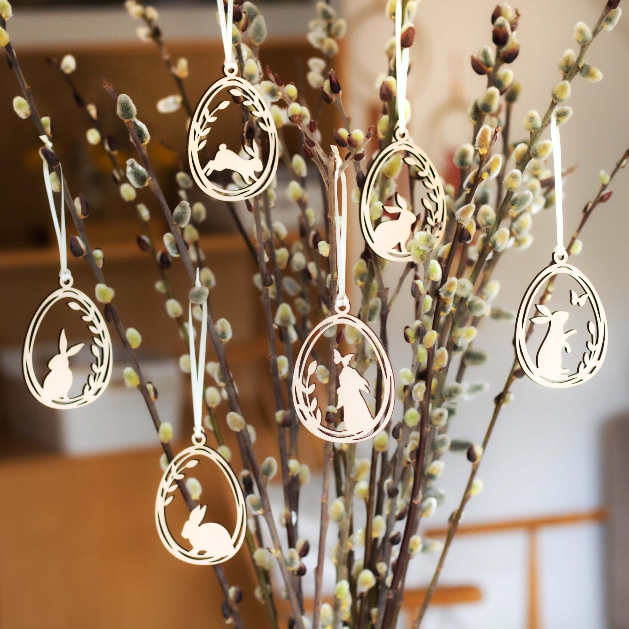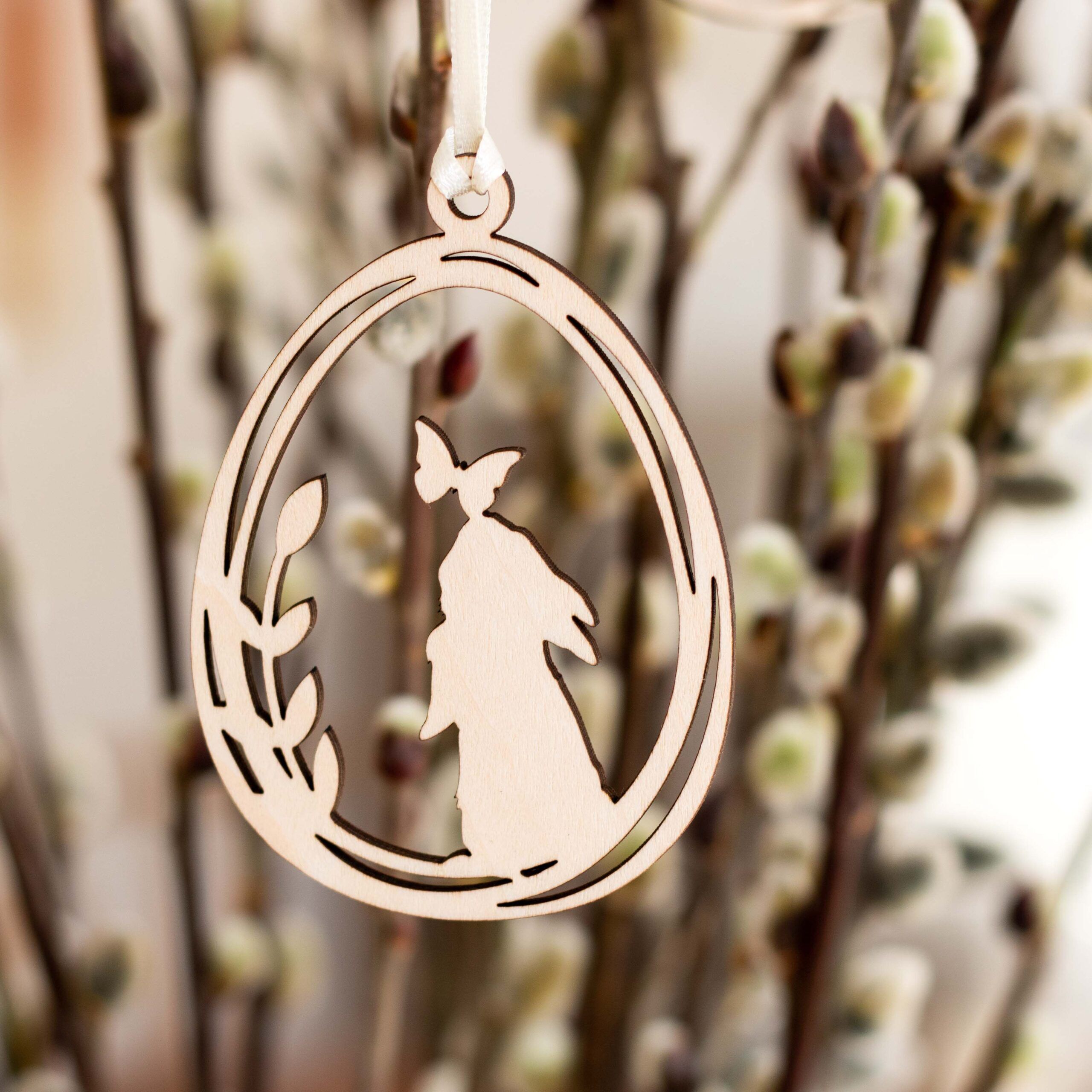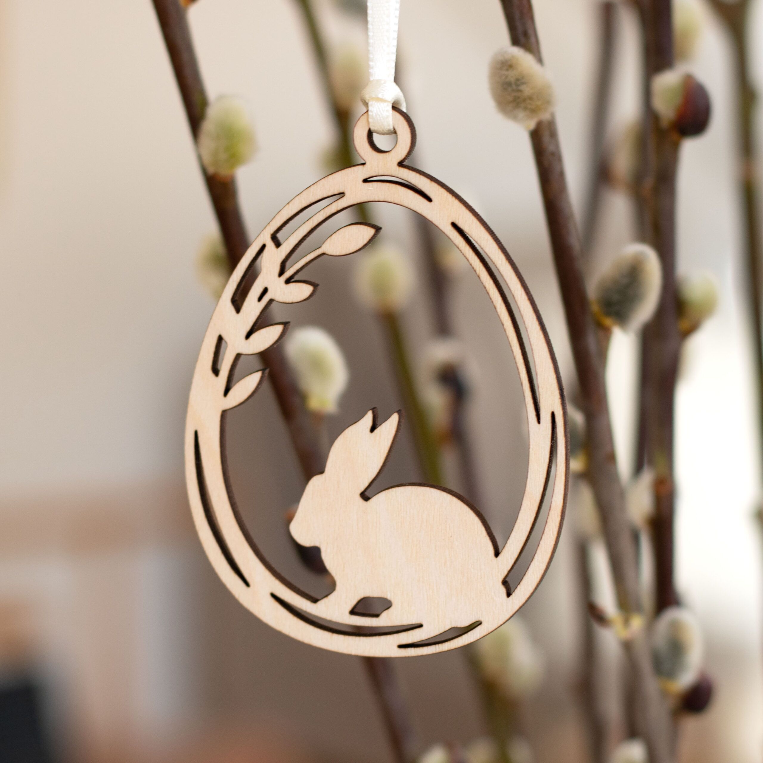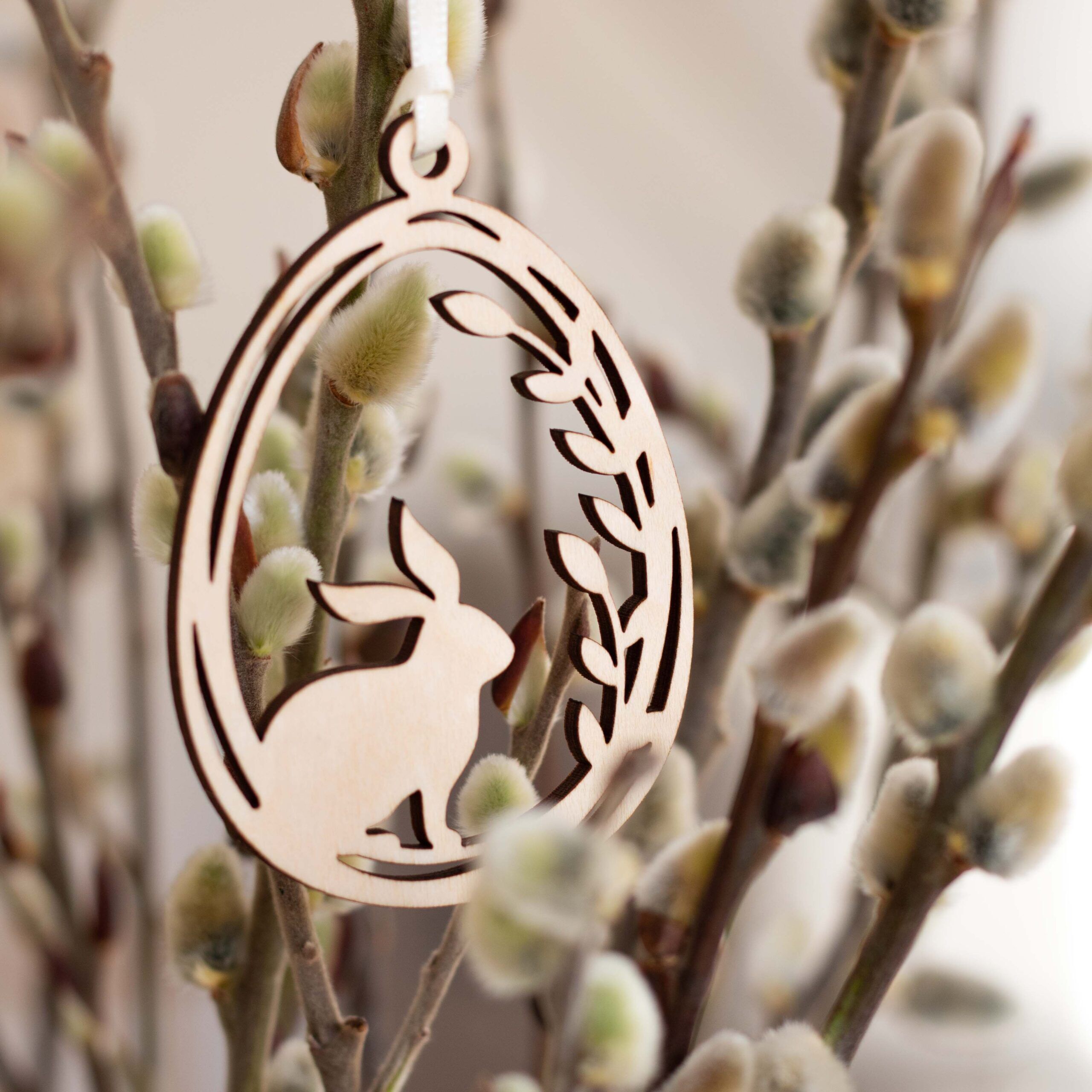 Die Holzanhänger mit den süßen Osterhäschen im Weidekätzchenei sind hübsche Anhänger für jeden Osterstrauß.