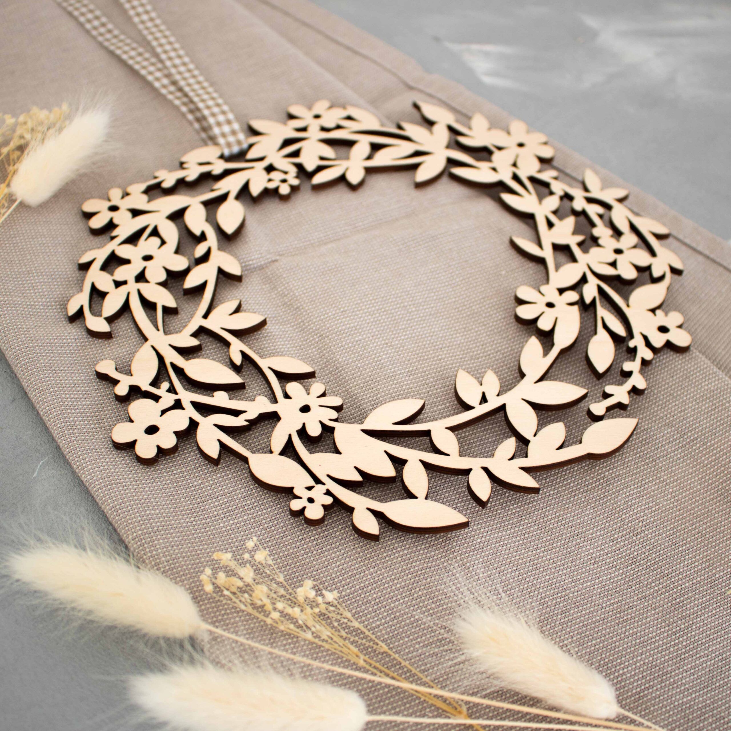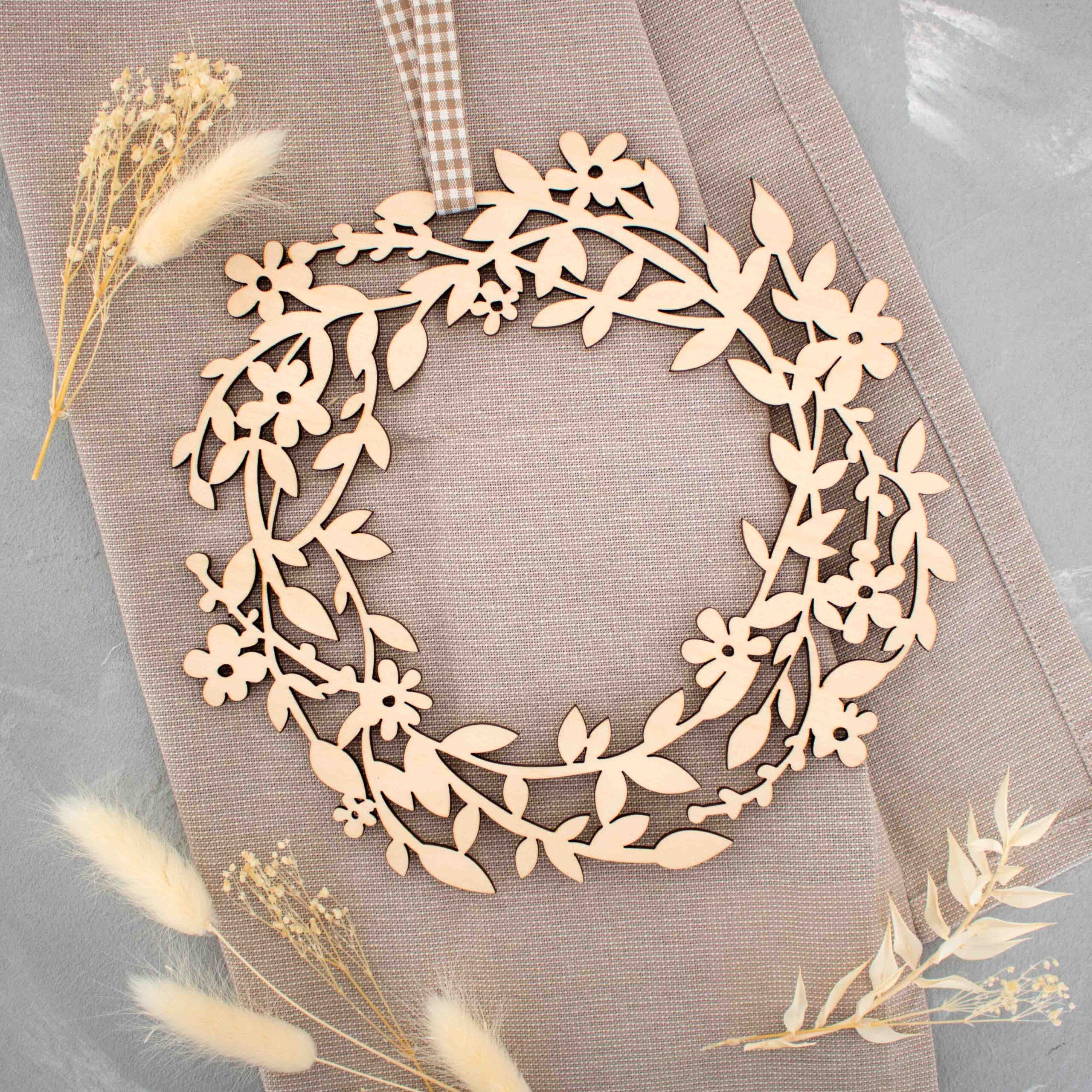 Da der Holzkranz naturbelassen ist, kann man ihn auch bemalen oder mit Trockenblumen dekorieren – da sind der Kreativität keine Grenzen gesetzt.