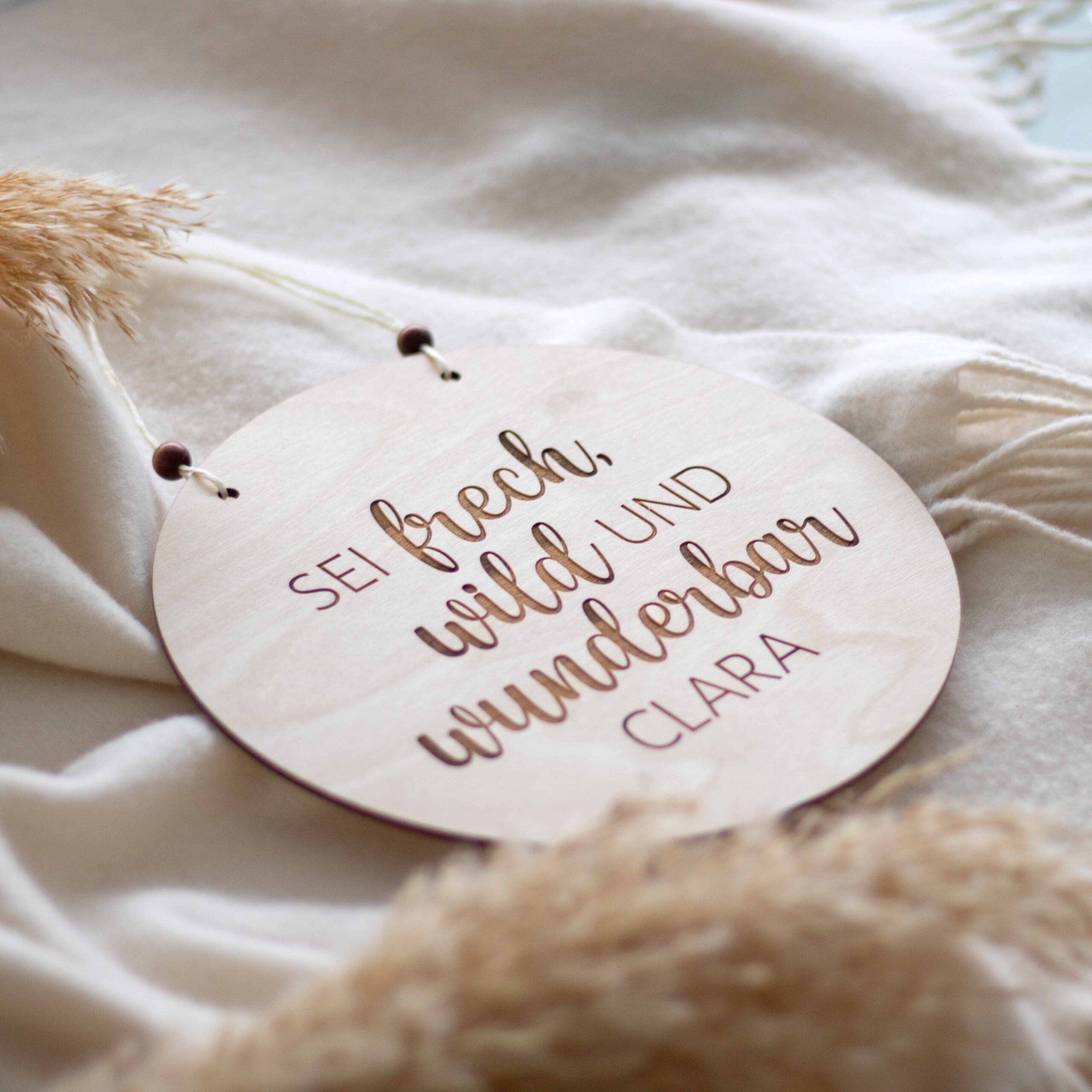 Das runde Schild mit dem Spruch wird mit dem Namen des Kindes personalisiert und ist ein Blickfang in jedem Kinderzimmer.