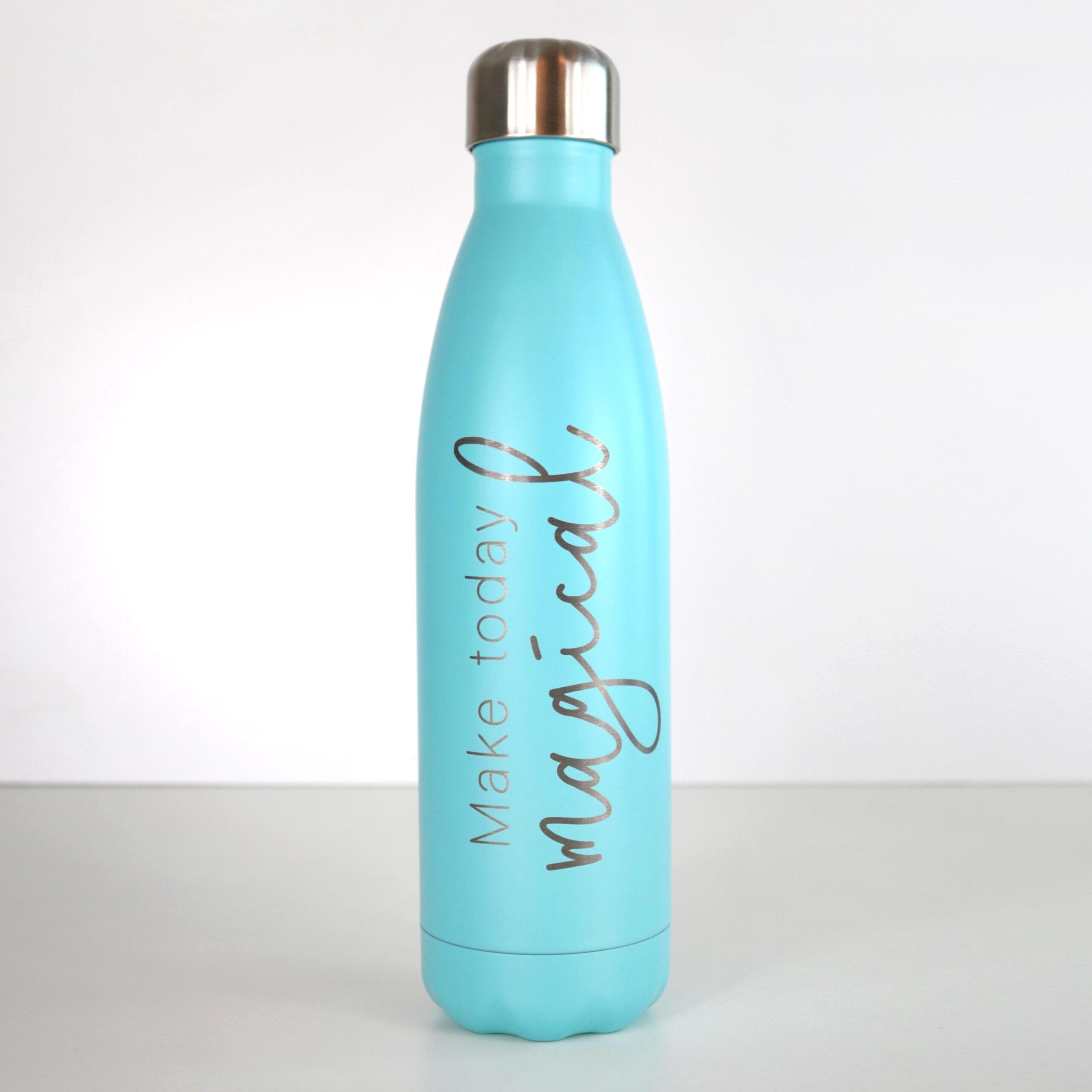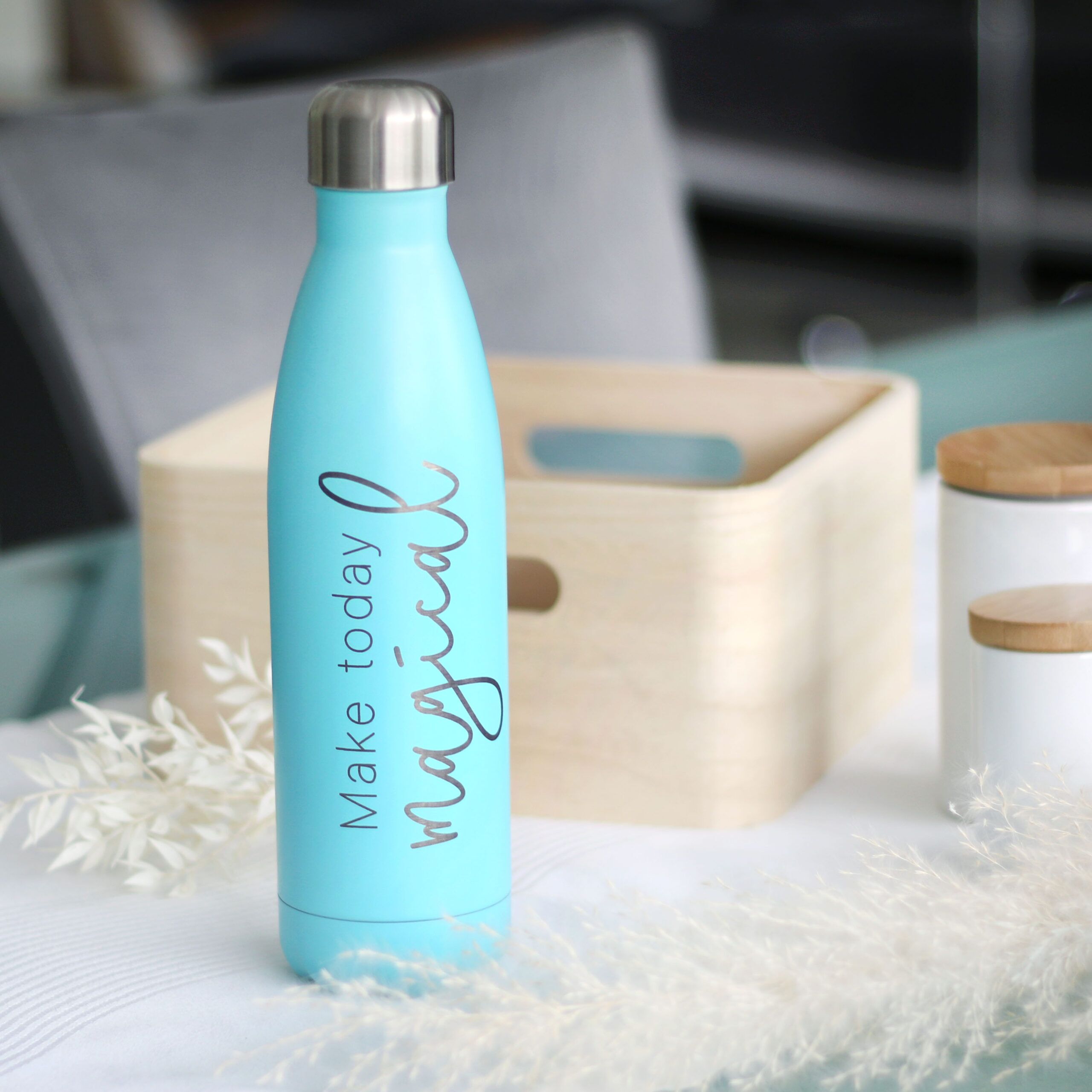 Isolierte Trinkflasche aus hochwertigem Edelstahl 304 mit graviertem Spruch „Make today magical“.