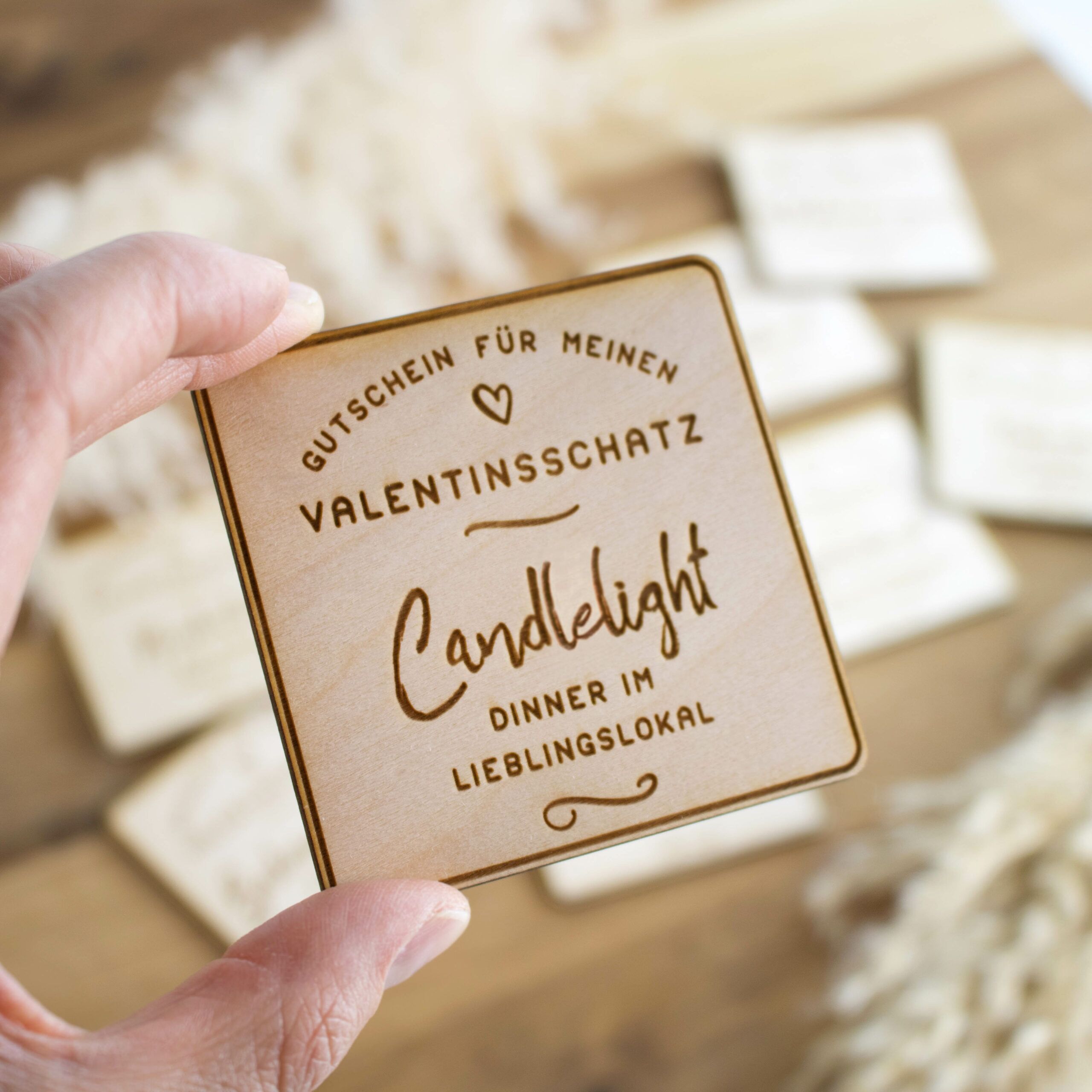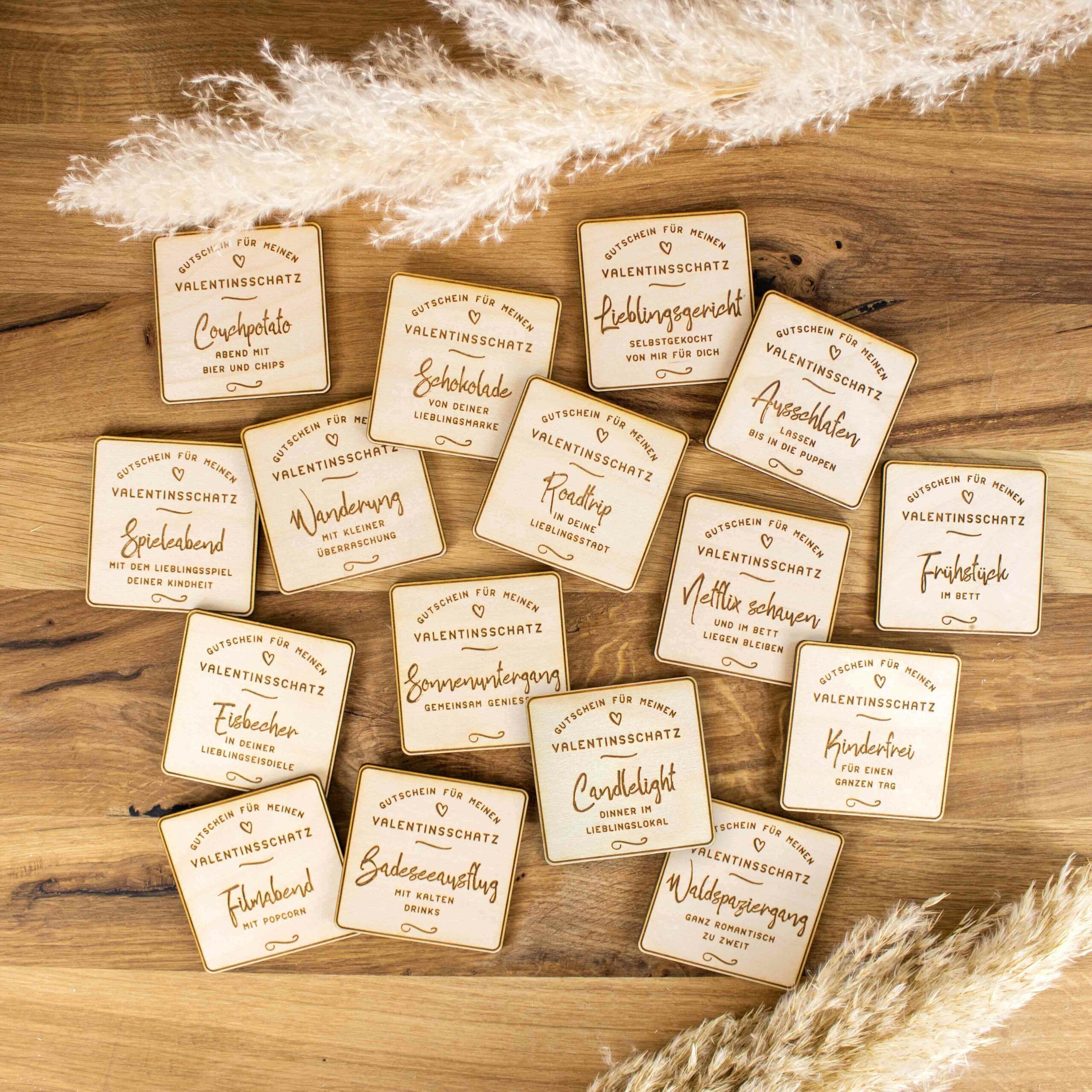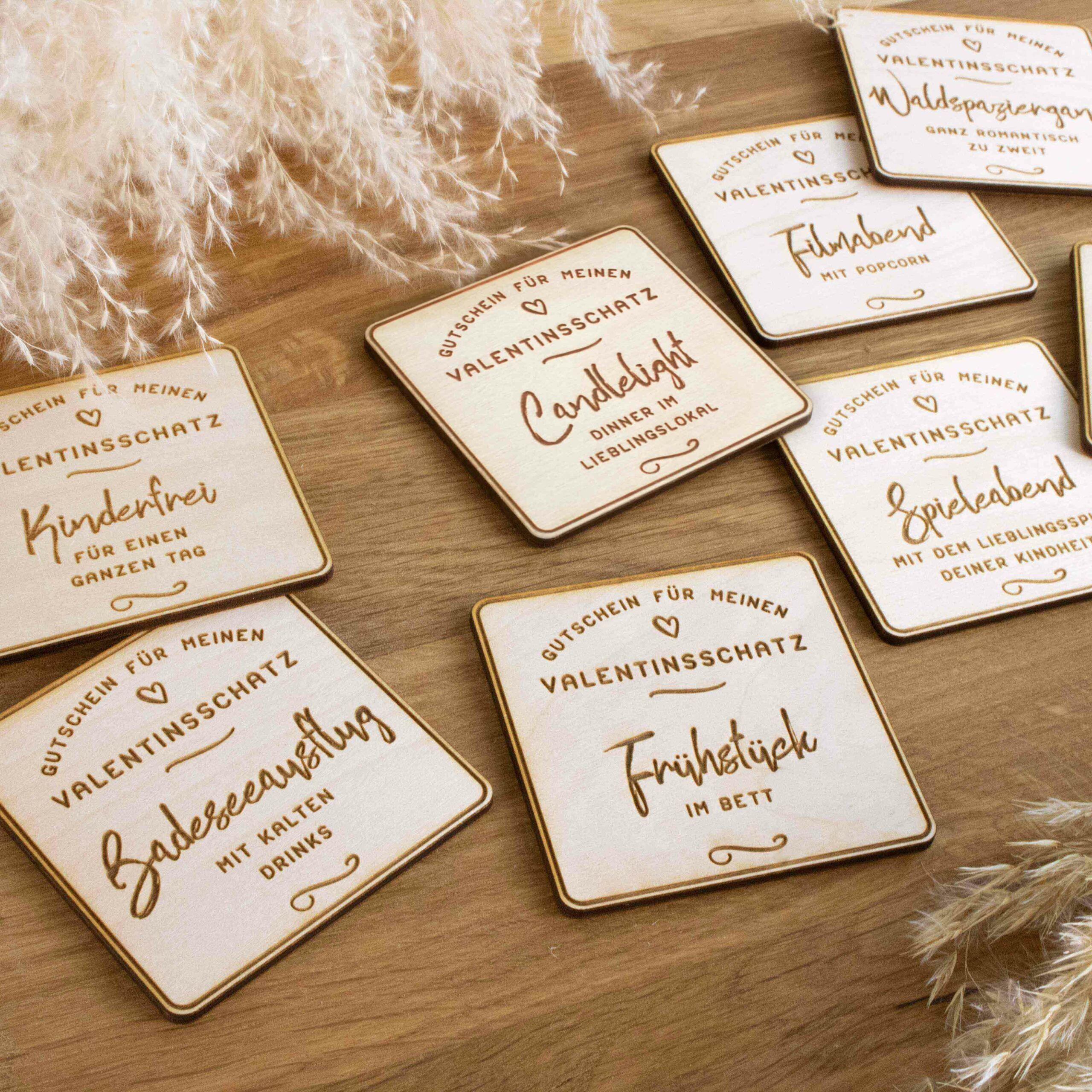 Die Gutscheinkarten mit originellen Ideen sind auf Holz graviert und lasergeschnitten. Eine wunderschöne und persönliche Gutscheinidee für Deinen Valentinsschatz.